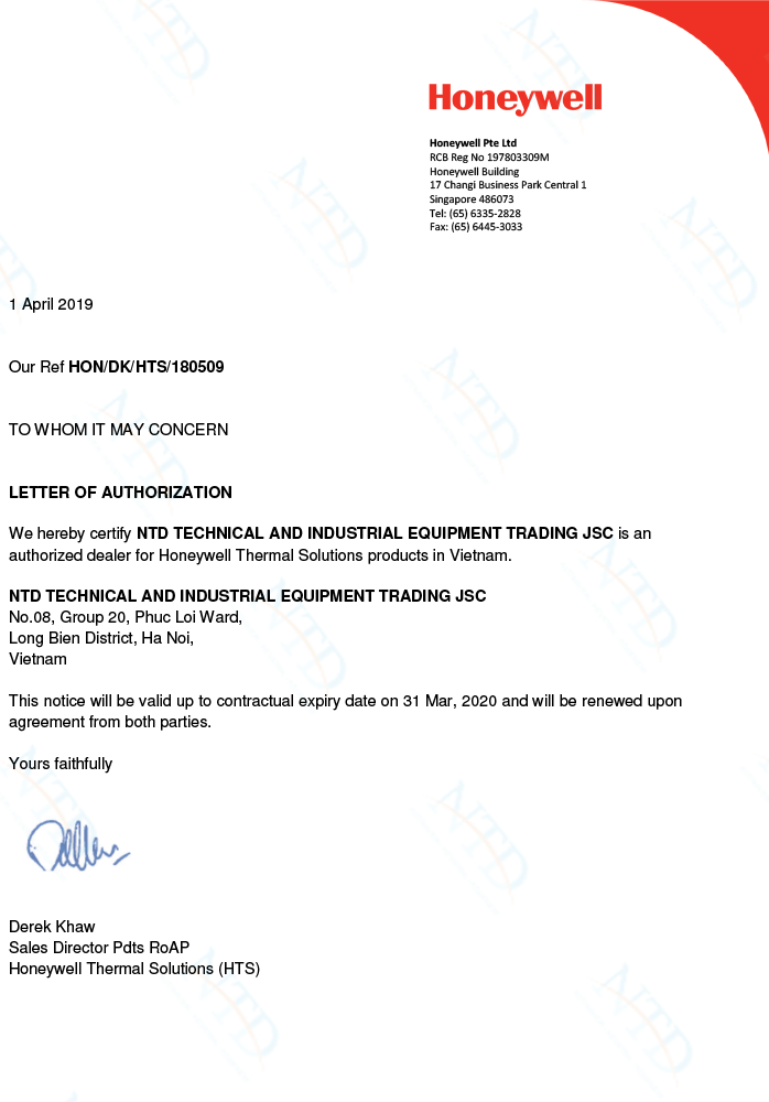 Chứng nhận đại diện NTD nhà phân phối HONEYWELL VIET NAM Distributor