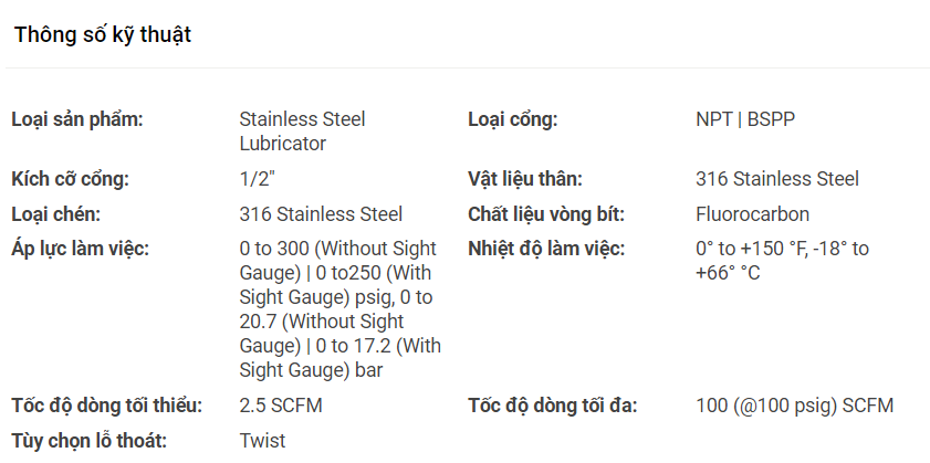 Bộ bôi trơn sương tiêu chuẩn thép không gỉ - Dòng PL10 (Tiêu chuẩn)