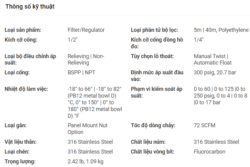 Bộ điều chỉnh lọc tiêu chuẩn bằng thép không gỉ - Dòng PB11, PB12