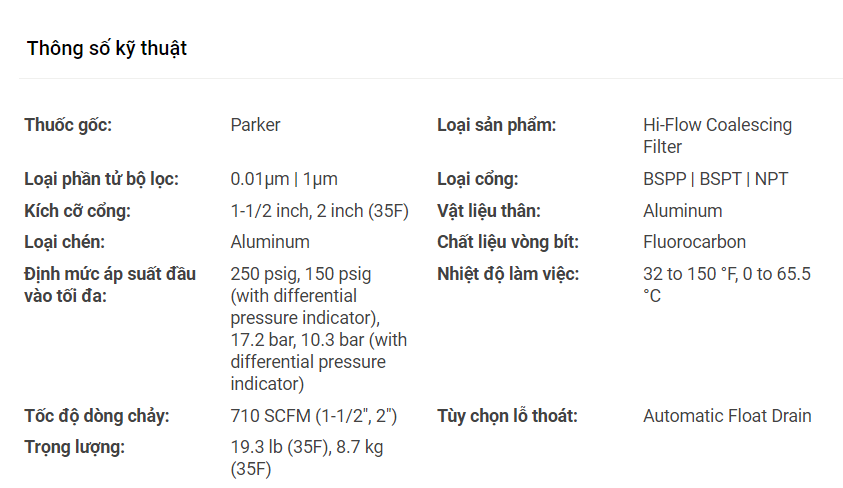 Bộ Lọc Hợp Nhất Hi-Flow - Dòng 35F, 43F (Loại Bỏ Dầu)-Parker