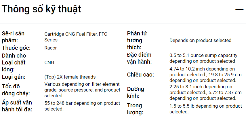 Bảo vệ kim phun nhiên liệu và hệ thống nhiên liệu thay thế. Lọc Racor CNG loại bỏ tạp chất nhỏ 0.3-0.6 micron.