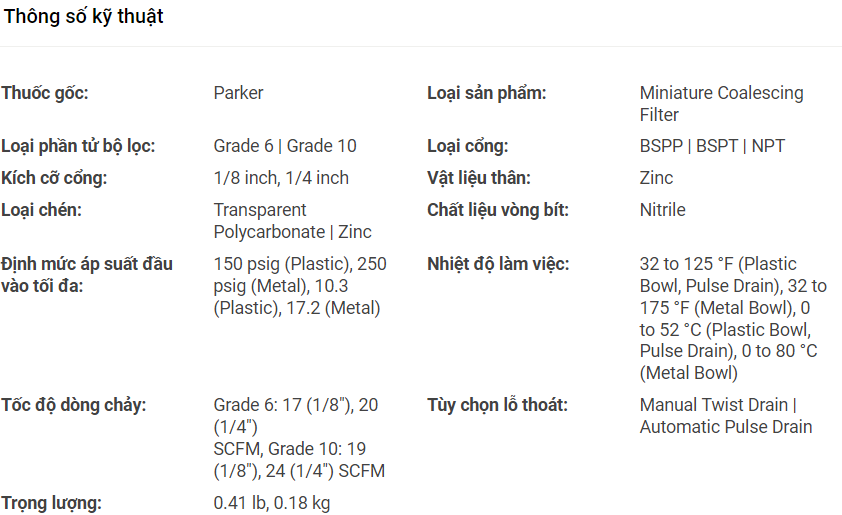 Bộ lọc 10F của Parker loại bỏ chất lỏng, dầu, và hạt bụi.