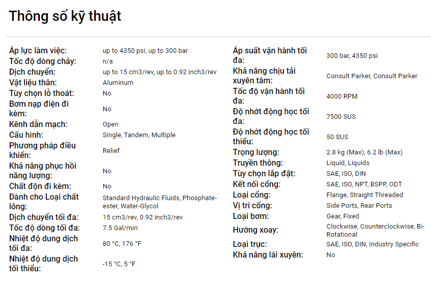 Bơm bánh răng PGP505 của Parker có hiệu suất cao nhờ cấu tạo nhôm.