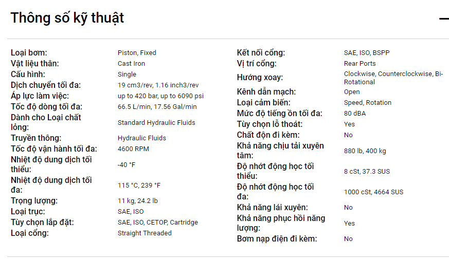 Bơm thủy lực Parker F11 có áp suất tối đa 420 bar và tốc độ tự mồi cao.