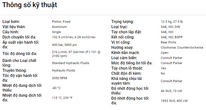 Bơm thủy lực Parker F1 chịu áp suất đến 400 bar, tốc độ 3050 rpm.