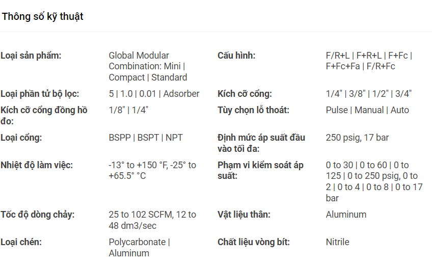 Các combo FRL toàn cầu là bộ lọc, điều áp và bôi trơn.