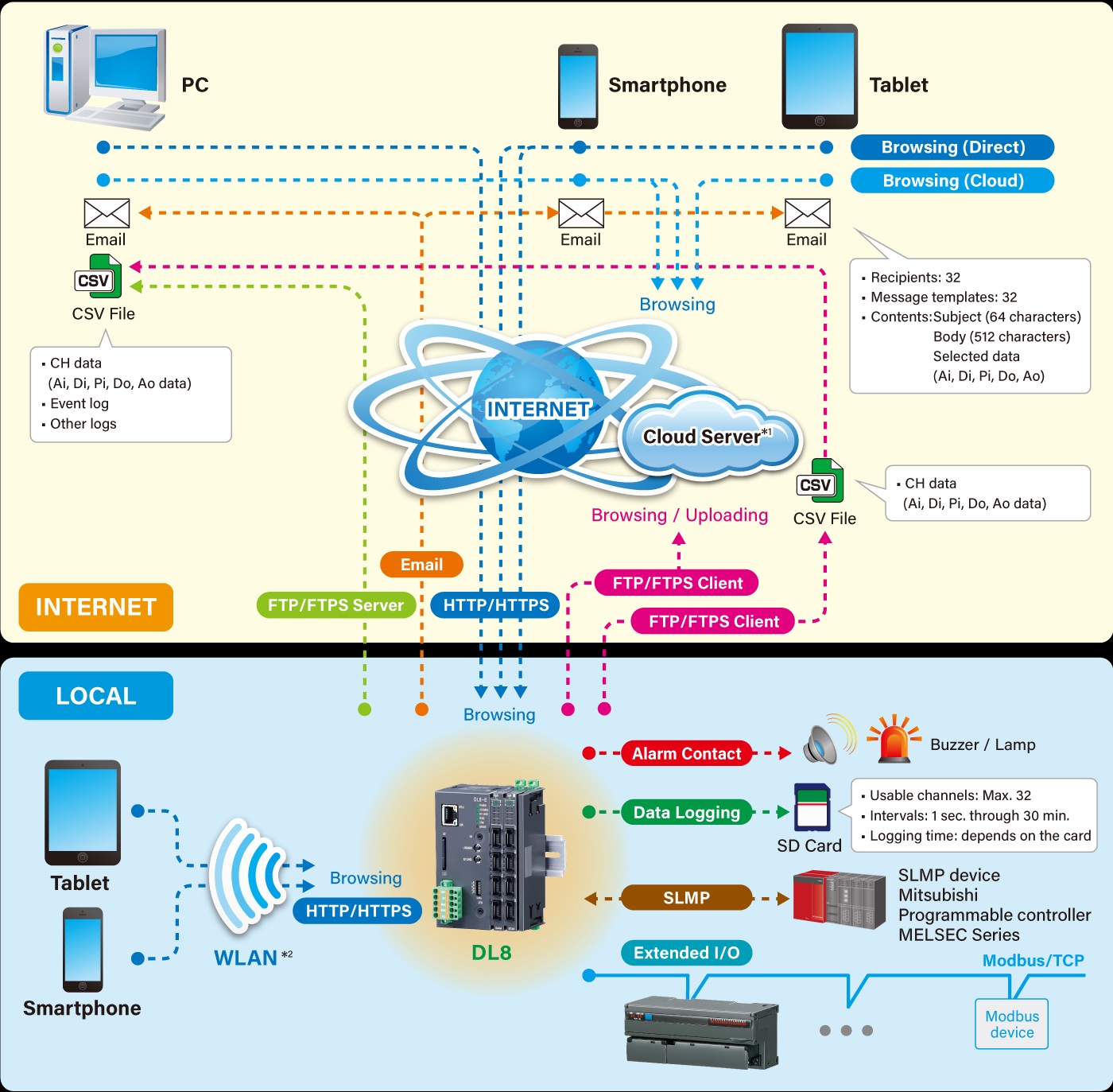Datalogger có khả năng kết nối với nhiều loại cảm biến, giúp ghi nhận đa dạng các thông số như nhiệt độ, áp suất, pH, độ đục, độ dẫn điện, mực nước hay lưu lượng. Tùy vào mục đích sử dụng, người dùng có thể lựa chọn các loại datalogger đơn giản chỉ có một vài kênh hoặc loại nâng cao có khả năng xử lý dữ liệu phức tạp với hàng trăm đầu vào.