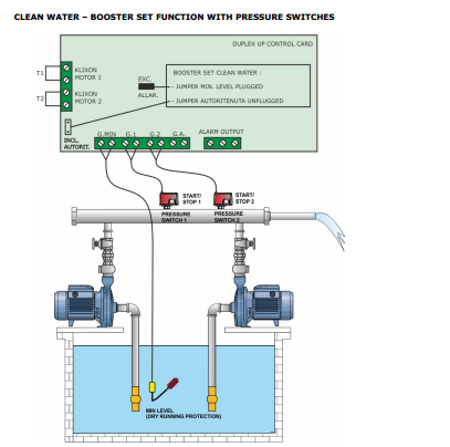 DUPLEX-UP được thiết kế để điều khiển hai động cơ hoặc máy bơm điện được sử dụng trong hệ thống điều áp hoặc trong các ứng dụng hút cạn giếng hoặc bể chứa nước bằng công tắc phao hoặc công tắc áp suất đa tiếp điểm.