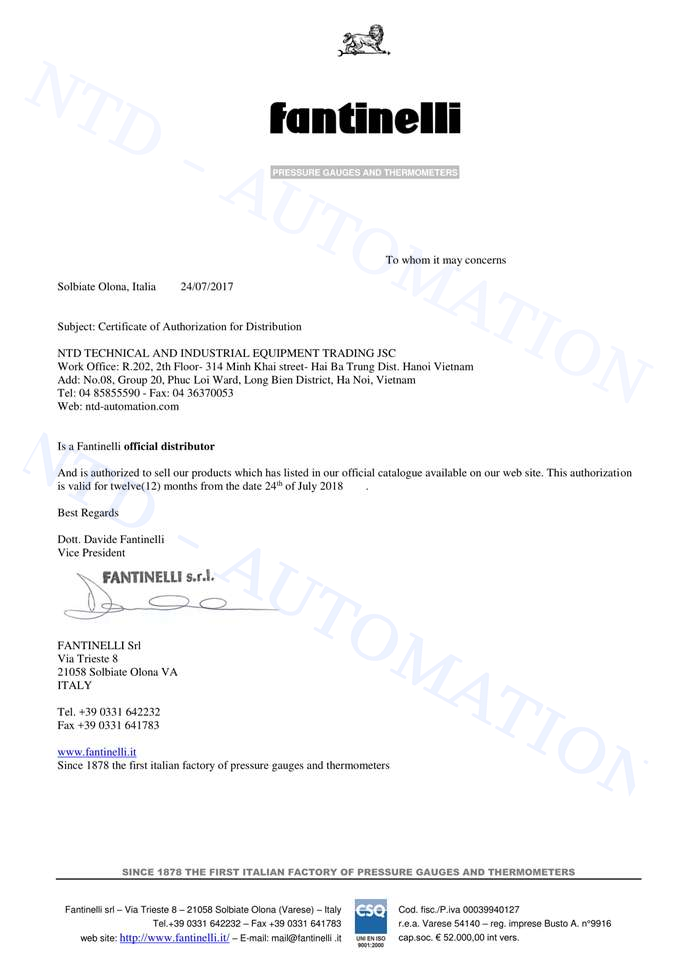Chứng Nhận Đại Diện Phân Phối FANTINELLI tại Việt Nam