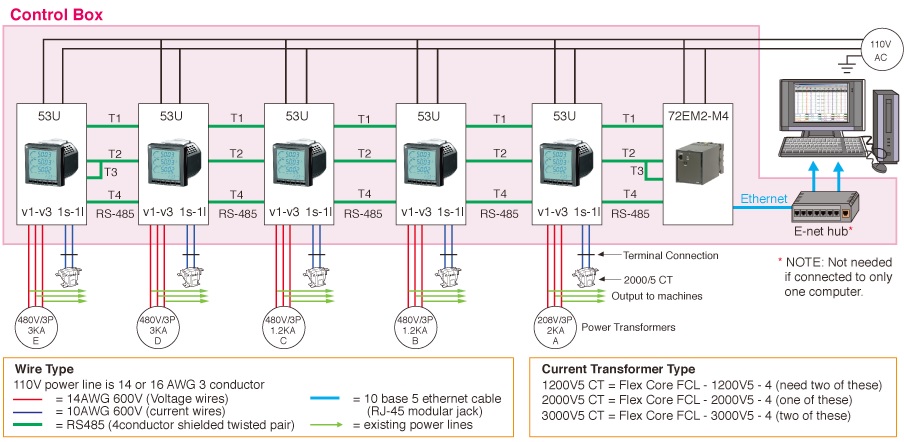 Người dùng đang sử dụng 53U để theo dõi lượng điện năng tiêu thụ của từng dây chuyền trong số 5 dây chuyền sản xuất khác nhau. Để làm điều này, họ đã kết nối màn hình đa nguồn 53U với từng máy biến áp trong số 5 máy biến áp chính vì nhà cung cấp điện của họ không thể cung cấp thông tin chi tiết về cách sử dụng cho mỗi máy biến áp hoặc dây chuyền sản xuất. Điều này mang lại sự giám sát tuyệt vời cho người dùng nếu có bất kỳ sự bất thường nào xảy ra cũng như khả năng truy nguyên lịch sử bằng phần mềm MSRPAC lưu trữ từng biến đo bằng tệp .csv. Các tệp này sau đó dễ dàng được xuất sang excel để phân tích thêm.