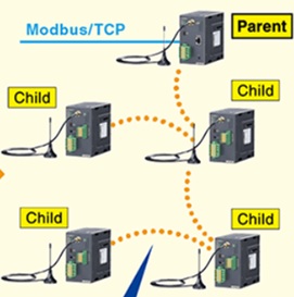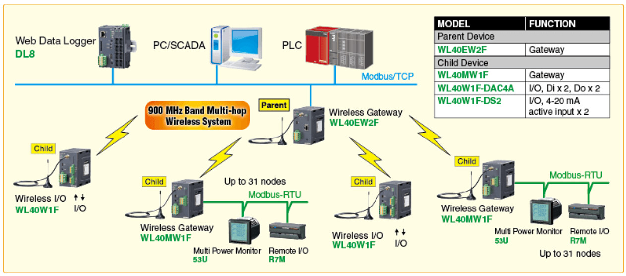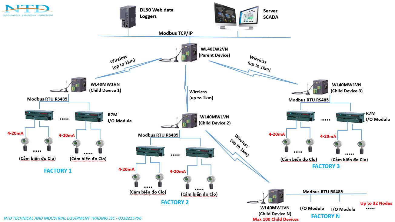 Các thiết bị WL40EW2VN (trạm mẹ) kết nối không dây với các trạm con (tối đa 100 trạm con ). Từ trạm mẹ ta kết nối với các hệ thống thu thập và giám sát dữ liệu như PLC, PC/Scada, Web Data Logger…. thông qua chuẩn truyền thông Modbus/TCP, do đó các tín hiệu cấp trường sẽ được đưa lên hệ thống điều khiển và giám sát -> giải quyết được các vấn đề truyền thông trong nhà máy gặp phải