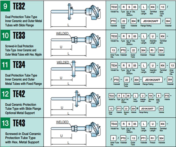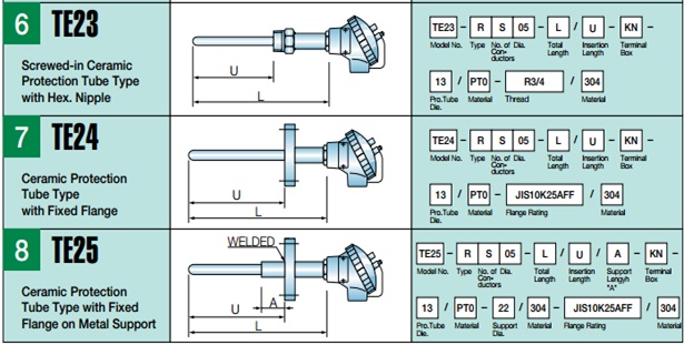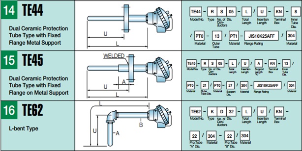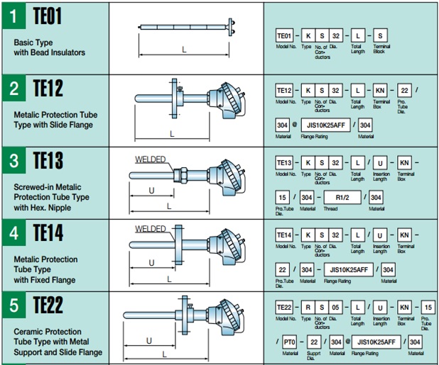 For economy and quicker delivery, 16 popular models were selected in five STANDARD LENGTH of 500, 800, 1000, 1200, 1500 mm hrough numerous proof in design and installations. It is recommended that the customer specify the probe length longer than actually needed among the above standard length, so that error by heat conductivity