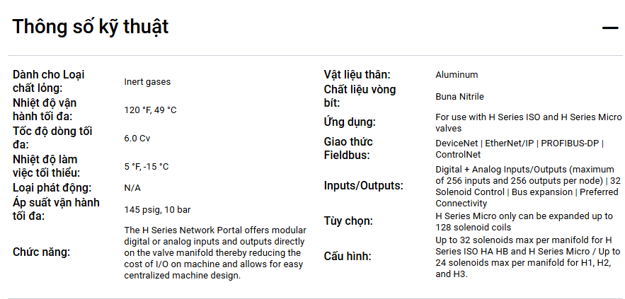 Cổng mạng H Series cung cấp đầu vào/ra số hoặc tương tự trên manifold van, giảm chi phí I/O và thiết kế máy tập trung dễ dàng.