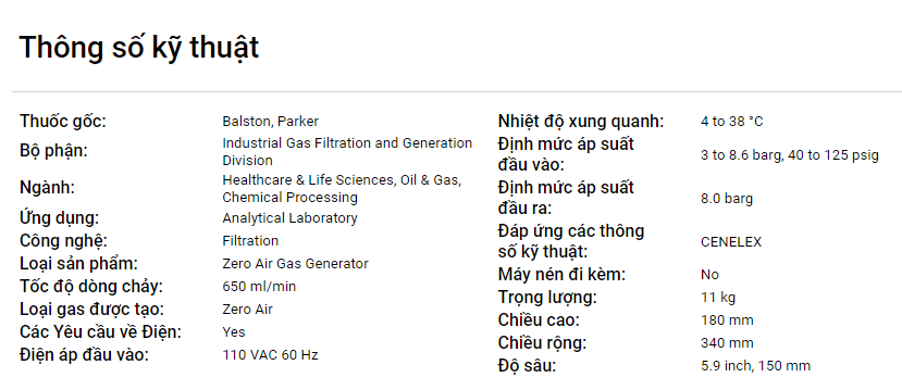 Máy tạo không khí Parker Balston cung cấp 1,000 cc/phút không khí tinh khiết.