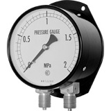 This pressure gauge features two pressure connections to measure simultaneously two different pressures for limited space instead of installing two pressure gauges. It can be used for railway application to measure both air tank pressure and break cylinder pressure with one indicator.