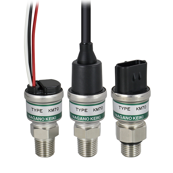 KM70 is a pressure transmitter using a "vapor deposition semiconductor strain gauge type sensor" which is widely used in various industrial applications. Since the pressure sensor is welded to the fitting, durability is excellent.