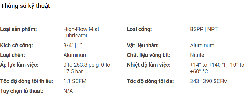 Parker's P3YL là bộ bôi trơn sương mù toàn cầu cho công cụ khí nén.