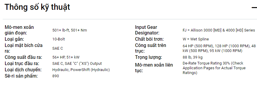 Chelsea 890 phù hợp với hộp số Allison 3000/4000, tăng tuổi thọ trục bơm.