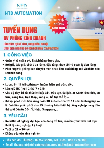 [LONG BIÊN] NTD AUTOMATION TUYỂN DỤNG 01 NHÂN VIÊN PHÒNG KINH DOANH 1. YÊU CẦU - Phòng kinh doanh: Nam/ Nữ tốt nghiệp đại học, cao đẳng trở lên có niềm yêu thích lĩnh vực thiết bị công nghiệp, kỹ...