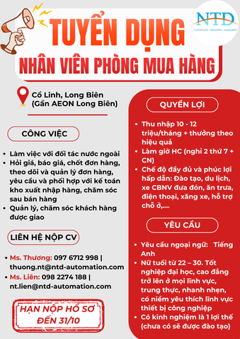 [LONG BIÊN] NTD AUTOMATION tuyển dụng nhân viên phòng mua hàng với thu nhập từ 10 - 12 triệu/tháng, đầy đủ phúc lợi, đãi ngộ 1. Quyền lợi Thu nhập 10 - 12 triệu/tháng + thưởng theo hiệu quả Làm giờ HC (nghỉ...